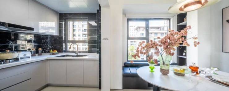 让餐厅成为家庭聚会的中心。这种开放式的设计不仅增加了空间的流动性,而且促进了共同生活的亲属之间的互动。黑色的飘窗柜与白墙的经典色搭配,以及侧柜发光亚克力隔板,逐步加强了餐厅空间的设计感和氛围感。